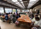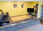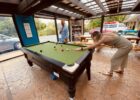 - Covered courtyard area showing log burner, dining tables, gas hobs and pool table
